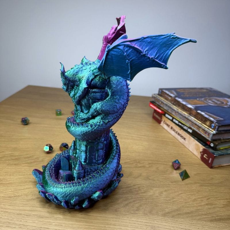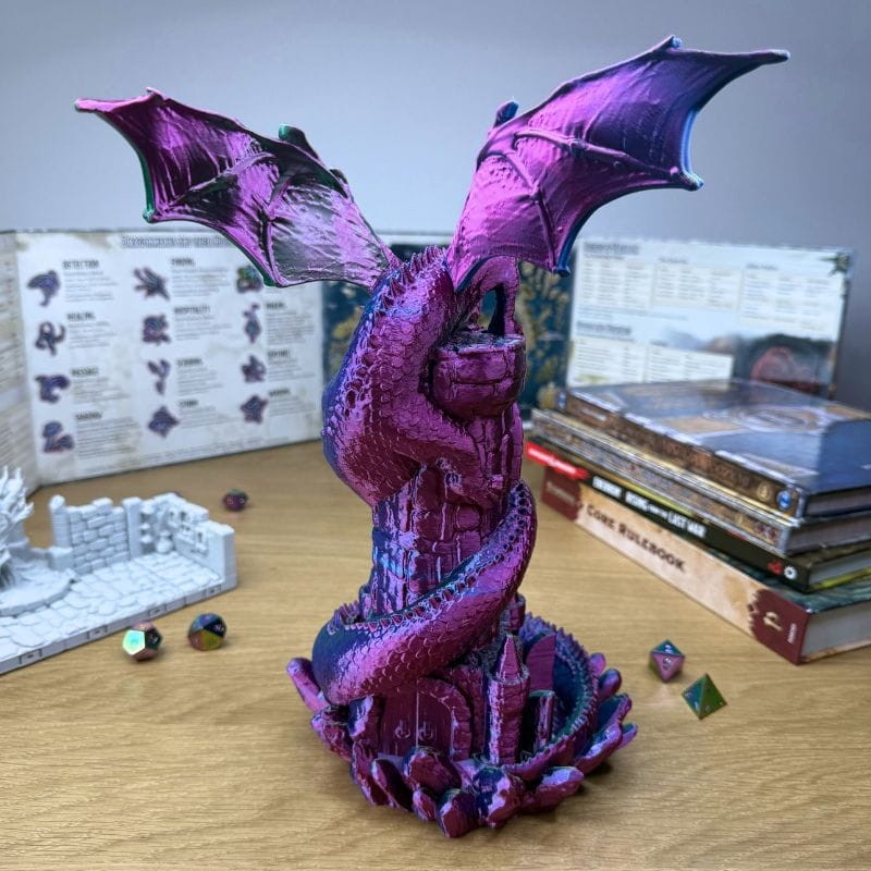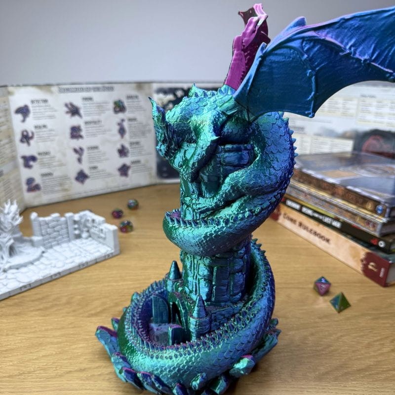 • Majestatyczny design: To nie jest zwykła wieża. To rzeźba przedstawiająca potężnego smoka oplatającego kamienną warownię. Niesamowita ilość detali, od łusek po pazury, czyni ją centralnym punktem każdego stołu do gry. To licencjonowany projekt, więc kupując go, wspierasz prawdziwego artystę!