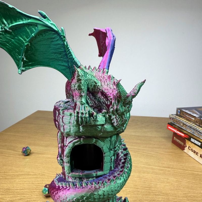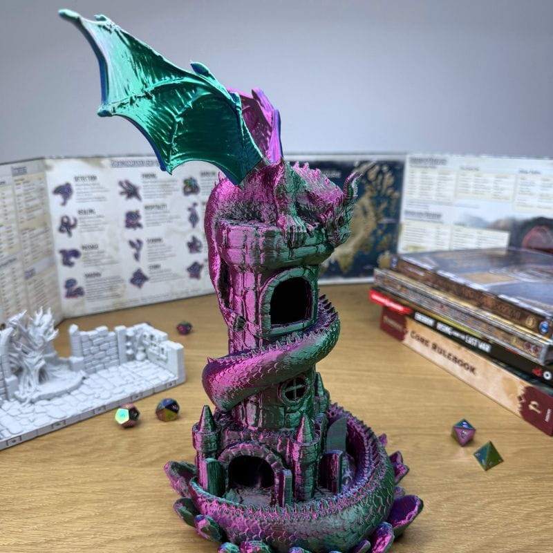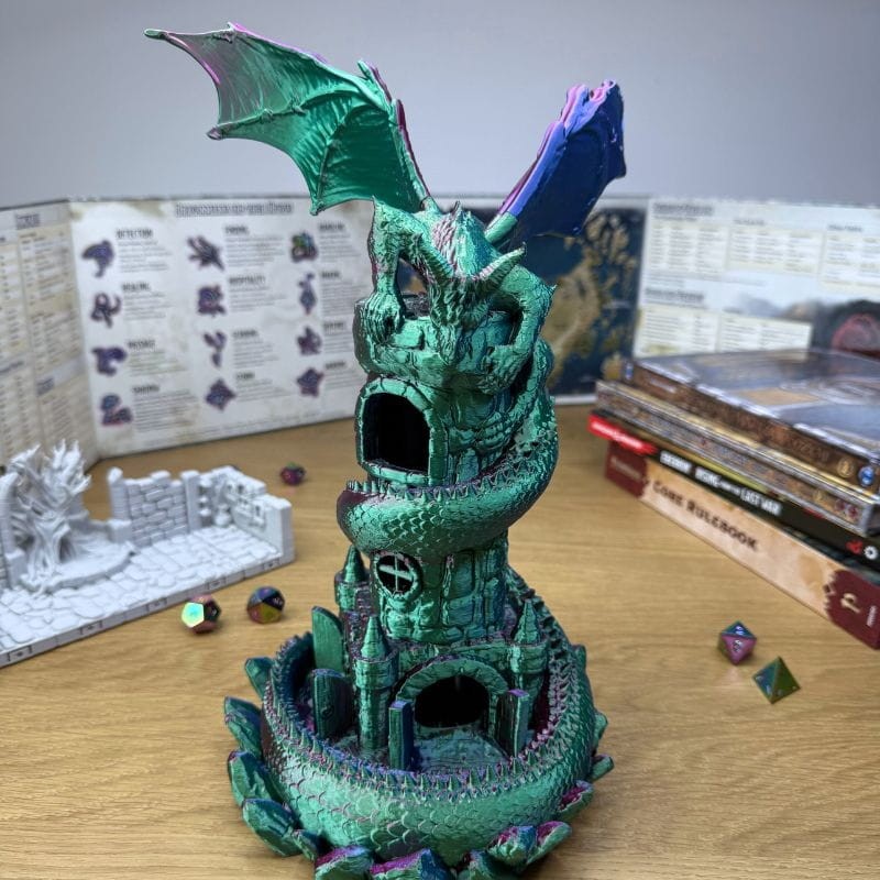Przedstawiamy Wieżę na Kości „Smoczy Strażnik” – arcydzieło, które łączy w sobie funkcjonalność profesjonalnego dice tower’a z zapierającym dech w piersiach wyglądem magicznego stwora.